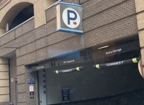 This on-site venue parking at the CFG Bank Arena is located on the right side of S Howard St, right after the intersection with W Lombard St. Look for a black wind sign that reads “Arena Garage” in yellow and a black overhead sign that reads “99 S Howard St” in white.
