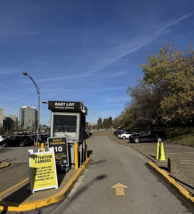 This on-site venue parking lot at PPG Paints Arena is located on the right side of westbound Centre Ave, between Crawford St and Fullerton St. Look for a gray attendant booth with a black sign that reads “East Lot Official Parking” in white at the lot entrance.